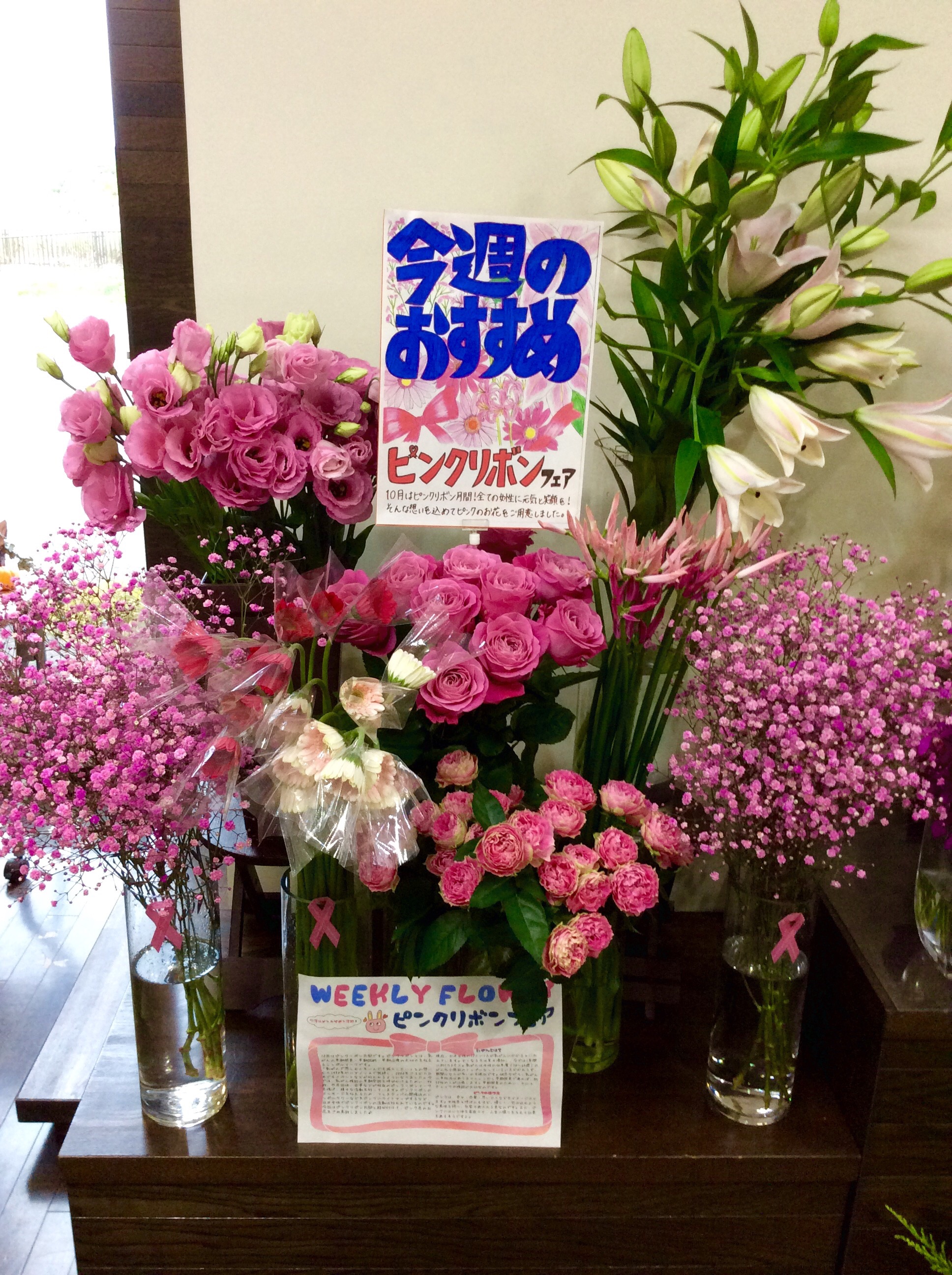 10月はピンクリボン月間です!ピンクリボンとは、乳がんの早期発見・早期診断・早期治療の大切さを伝えるシンボルマークです。「乳がんで悲しむ人を1人でも減らしたい」との想いから1980年代にアメリカで発祥し、2000年頃から日本でもフェスティバル開催地でシンボルタワーのライトアップするなど、日本全国で行なわれるようになりました。ピンクリボン月間と結びつけて、ピンク色のお花を御用意致しました!